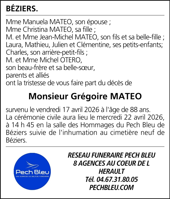 Cimetière Neuf de BEZIERS le mercredi 22 avril à 15 heures 30