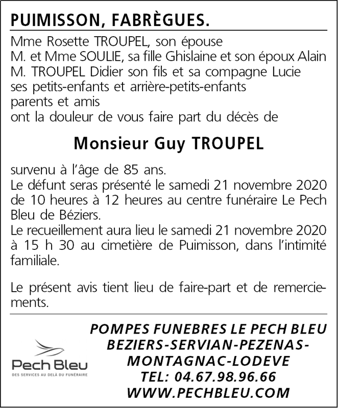 Décédé à Bédarieux (34600, France) le mercredi 18 novembre 2020 à l'âge de 85 ans