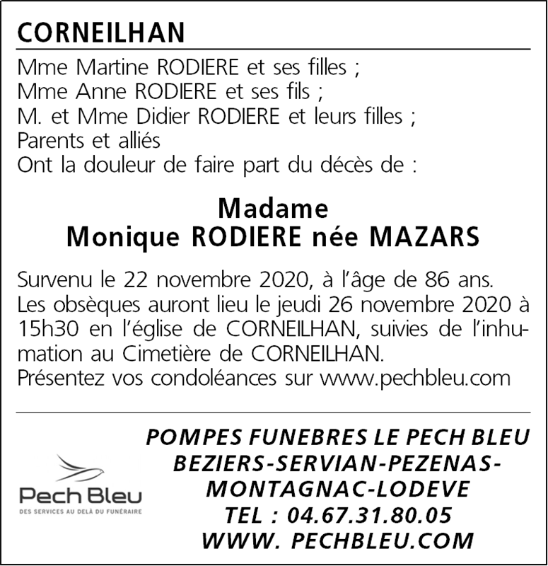 Décédée à Béziers (34500, France) le dimanche 22 novembre 2020 à l'âge de 86 ans