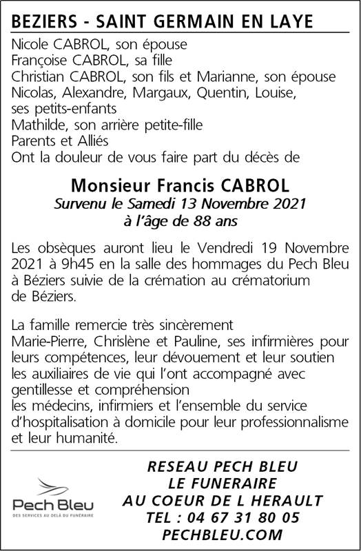 Décédé à Béziers (34500, France) le samedi 13 novembre 2021 à l'âge de 88 ans