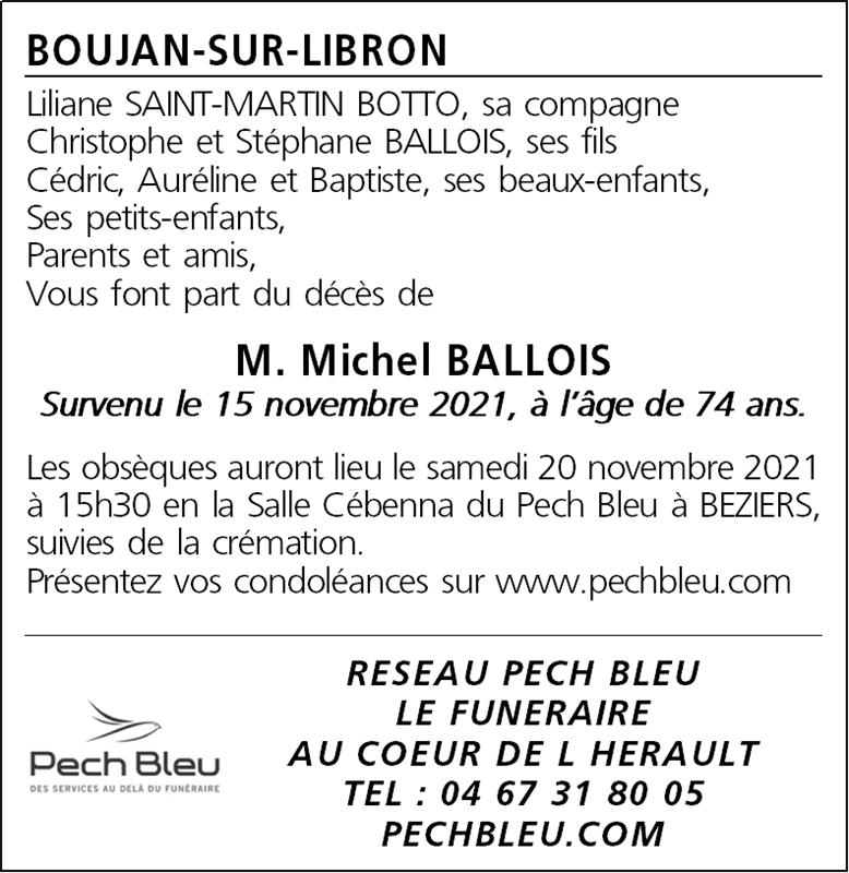 Décédé à Boujan-sur-Libron (34760, France) le lundi 15 novembre 2021 à l'âge de 74 ans