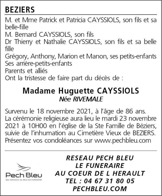 Veuve de Monsieur André CAYSSIOLS