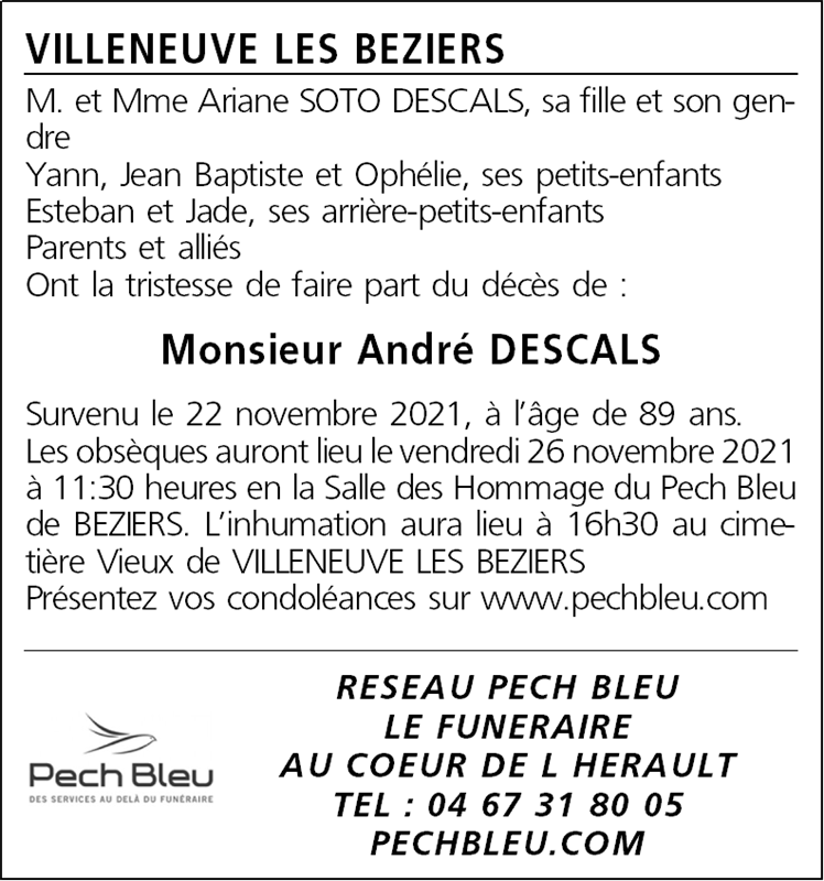 Décédé à Béziers (34500, France) le lundi 22 novembre 2021 à l'âge de 89 ans