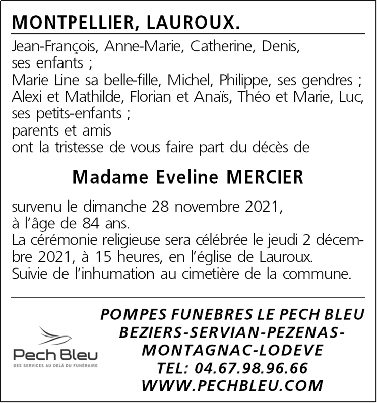 Décédée à Aubais (30250, France) le dimanche 28 novembre 2021 à l'âge de 84 ans