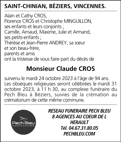 Décédé à Béziers (34500, France) le mardi 24 octobre 2023 à l'âge de 94 ans