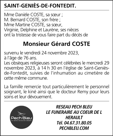 Décédé à Saint-Geniès-de-Fontedit (34480, France) le vendredi 24 novembre 2023 à l'âge de 76 ans