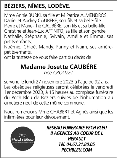 Décédée à Milhaud (30540, France) le lundi 27 novembre 2023 à l'âge de 92 ans