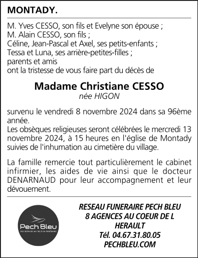 Décédée à Montady (34310, France) le vendredi 8 novembre 2024 à l'âge de 95 ans