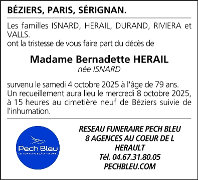 Décédée à Cers (34420, France) le vendredi 3 octobre 2025 à l'âge de 79 ans