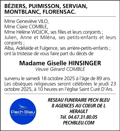 Décédée à Béziers (34500, France) le samedi 18 octobre 2025 à l'âge de 89 ans