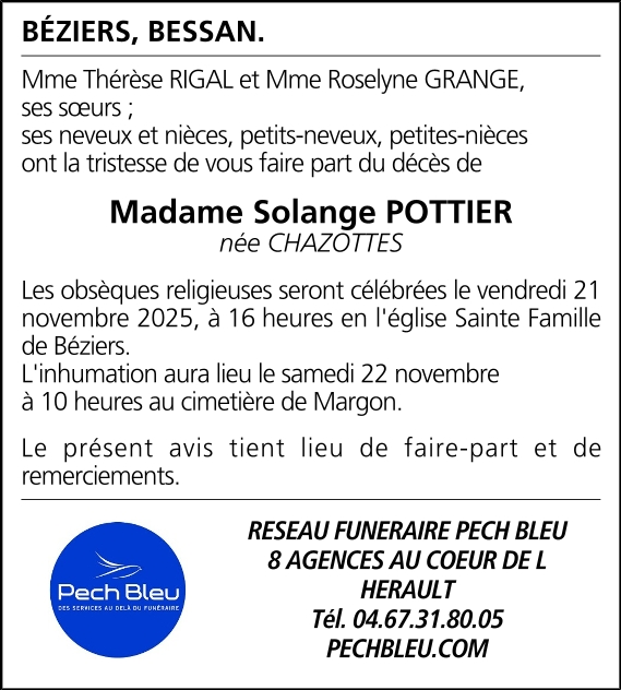 Décédée à Béziers (34500, France) le vendredi 14 novembre 2025 à l'âge de 87 ans