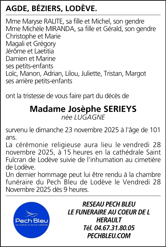 Décédée à Béziers (34500, France) le dimanche 23 novembre 2025 à l'âge de 101 ans