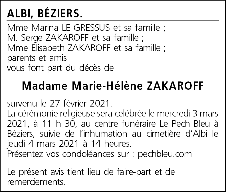 Décédée à Béziers (34500, France) le samedi 27 février 2021 à l'âge de 84 ans