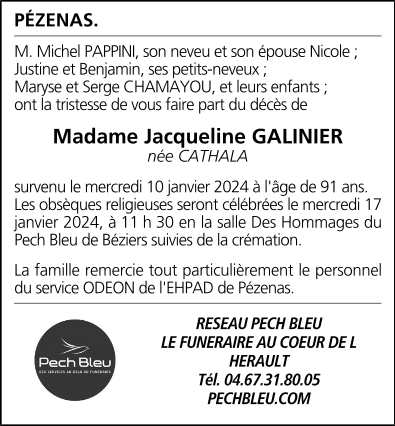 Décédée à Pézenas (34120, France) le mercredi 10 janvier 2024 à l'âge de 91 ans