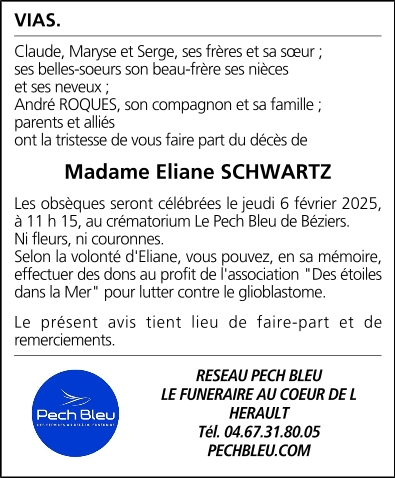 Décédée à Vias (34450, France) le mercredi 29 janvier 2025 à l'âge de 76 ans