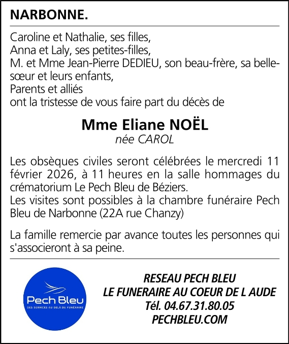 Décédée à Narbonne (11100, France) le dimanche 1 février 2026 à l'âge de 85 ans