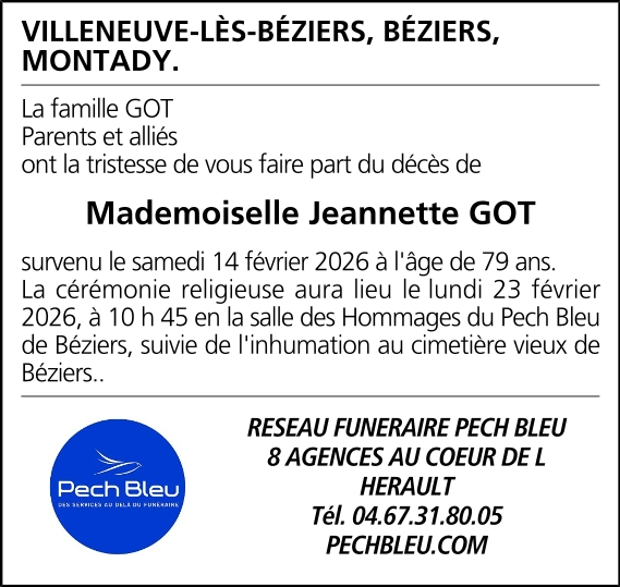 Décédée à Béziers (34500, France) le samedi 14 février 2026 à l'âge de 79 ans