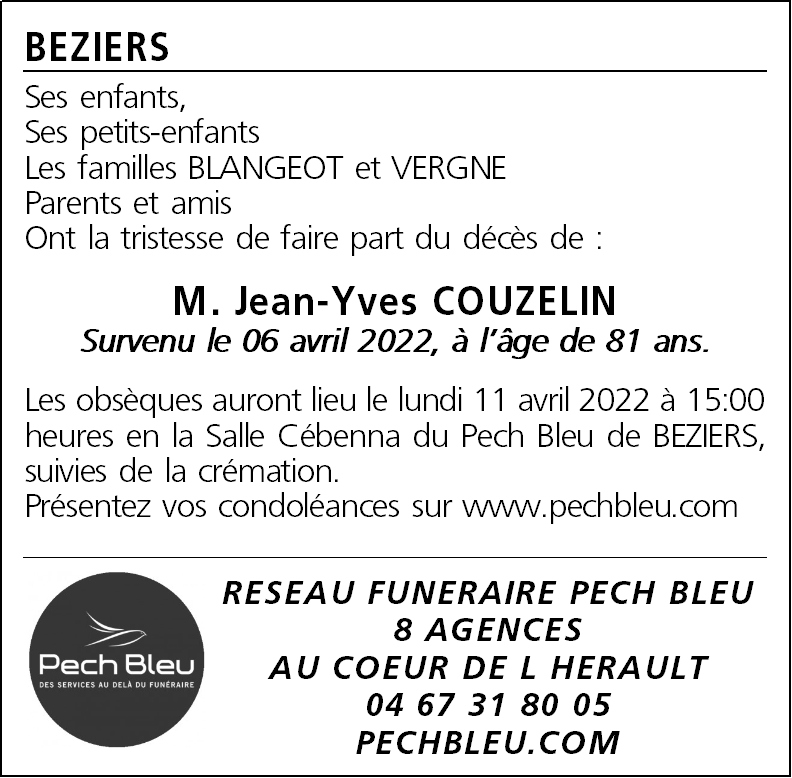 Décédé à Béziers (34500, France) le mercredi 6 avril 2022 à l'âge de 81 ans