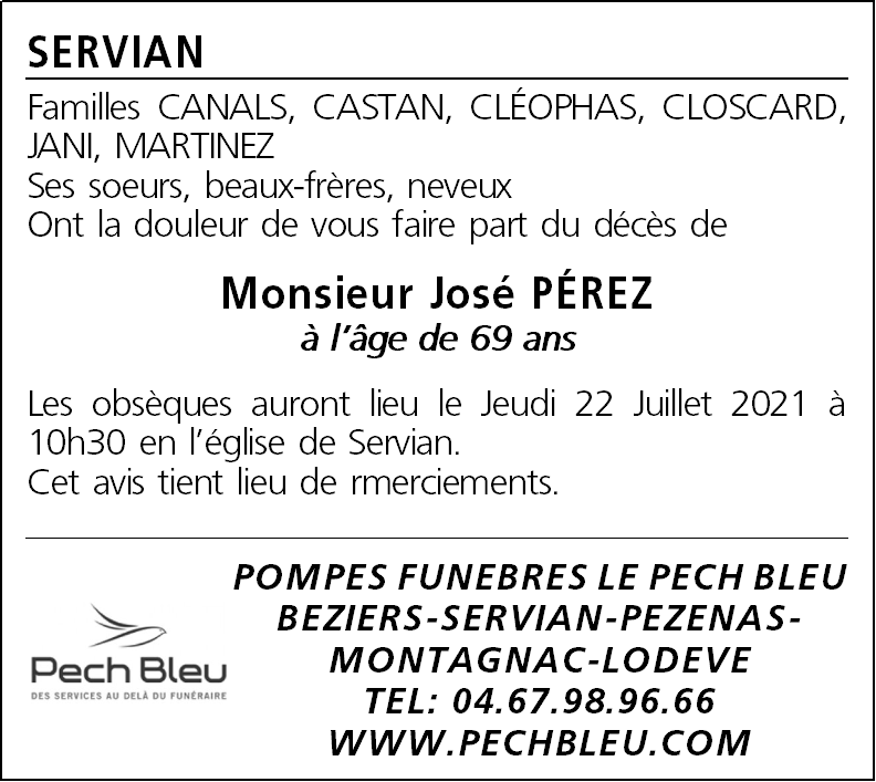 Décédé à Béziers (34500, France) le lundi 19 juillet 2021 à l'âge de 69 ans