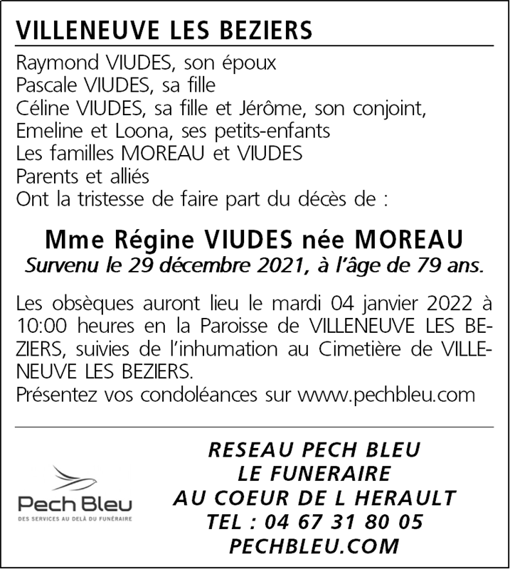 Décédée à Villeneuve-lès-Béziers (34420, France) le mercredi 29 décembre 2021 à l'âge de 79 ans