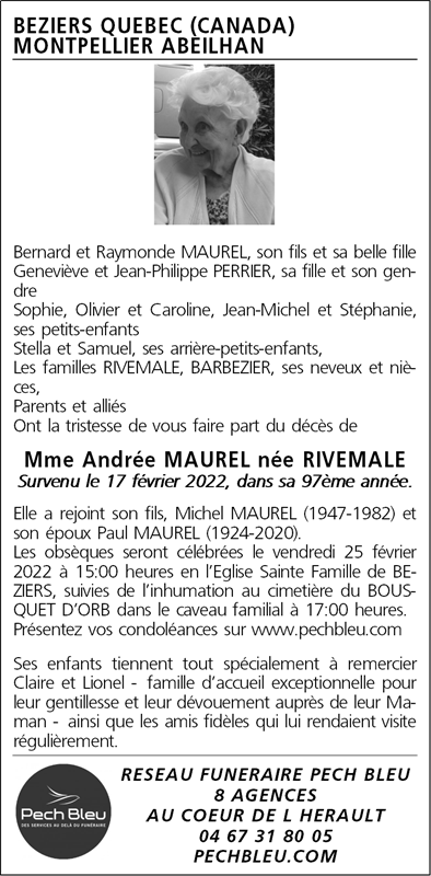 Décédée à Puisserguier (34620, France) le jeudi 17 février 2022 à l'âge de 96 ans