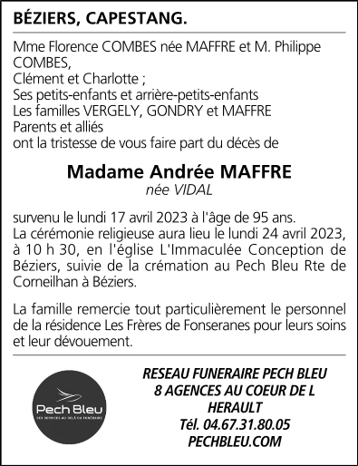 Décédée à Béziers (34500, France) le lundi 17 avril 2023 à l'âge de 95 ans