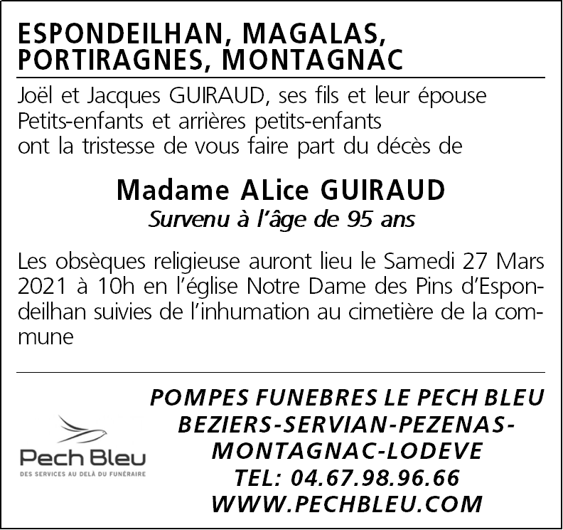 Décédée à Béziers (34500, France) le mardi 23 mars 2021 à l'âge de 95 ans