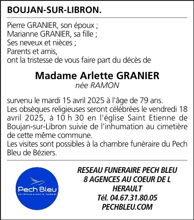 Décédée à Boujan-sur-Libron (34760, France) le mardi 15 avril 2025 à l'âge de 79 ans