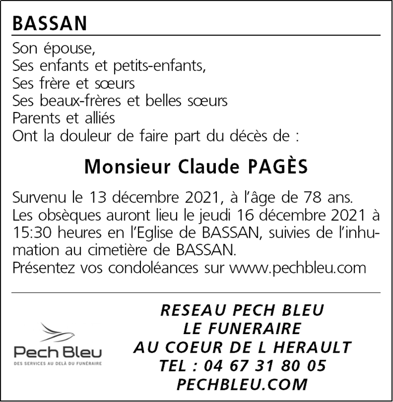 Décédé à Béziers (34500, France) le lundi 13 décembre 2021 à l'âge de 78 ans