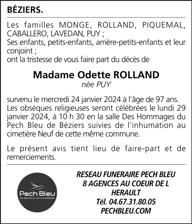 Décédée à Béziers (34500, France) le mercredi 24 janvier 2024 à l'âge de 97 ans
