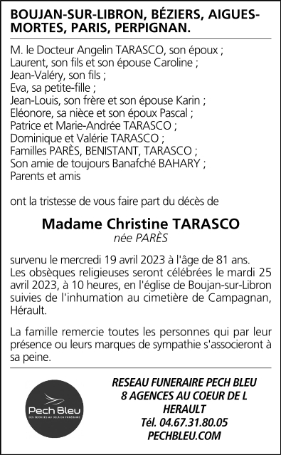 Décédée à Boujan-sur-Libron (34760, France) le mercredi 19 avril 2023 à l'âge de 81 ans