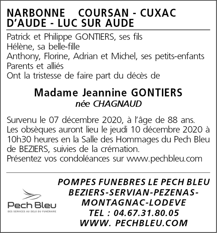 Décédée à Carcassonne (11000, France) le lundi 7 décembre 2020 à l'âge de 88 ans