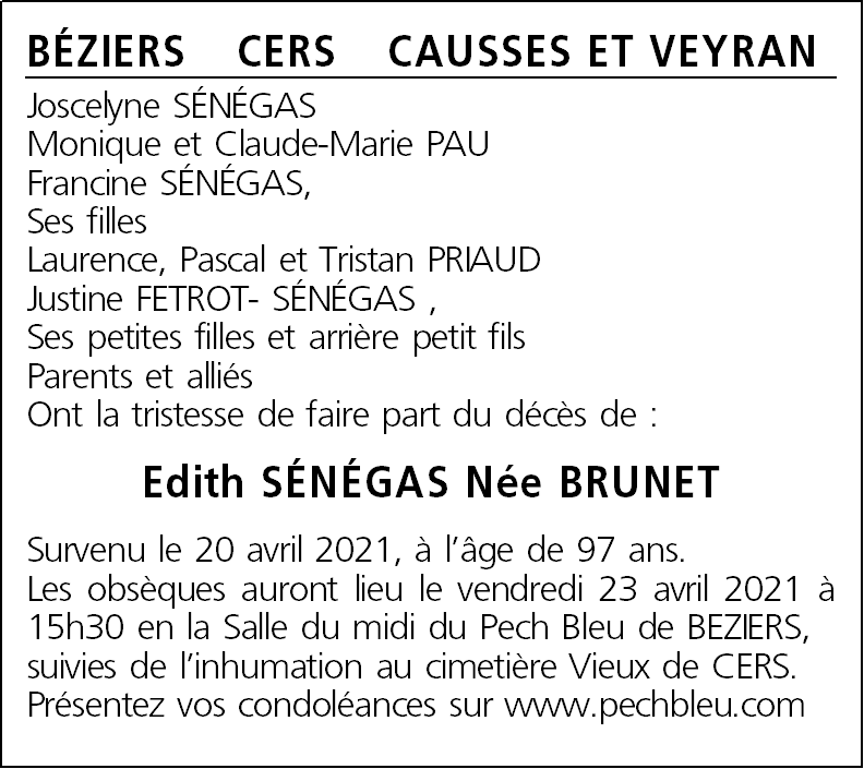 Madame Edith SENEGAS née BRUNET