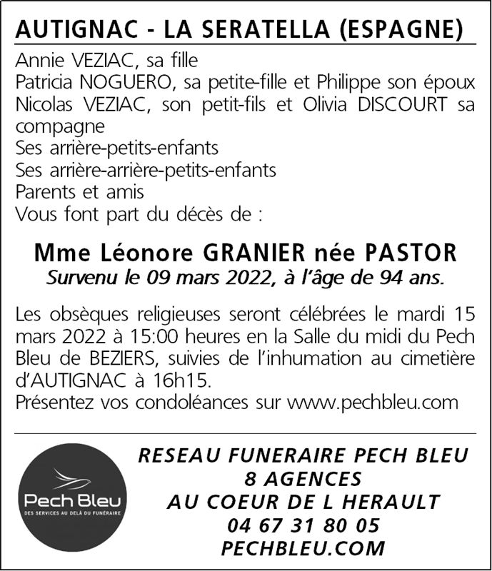 Décédée à Autignac (34480, France) le mercredi 9 mars 2022 à l'âge de 94 ans