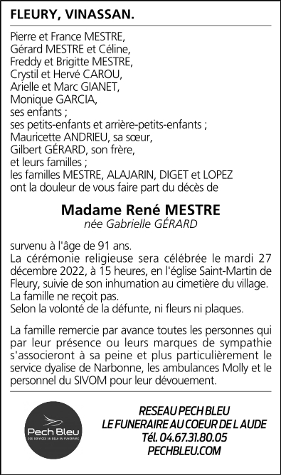 Décédée à Montredon-des-Corbières (11100, France) le vendredi 23 décembre 2022 à l'âge de 91 ans