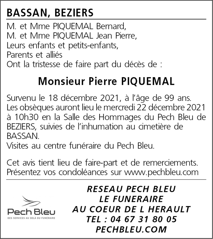 Décédé à Béziers (34500, France) le samedi 18 décembre 2021 à l'âge de 99 ans