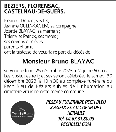 Décédé à Béziers (34500, France) le lundi 25 décembre 2023 à l'âge de 60 ans