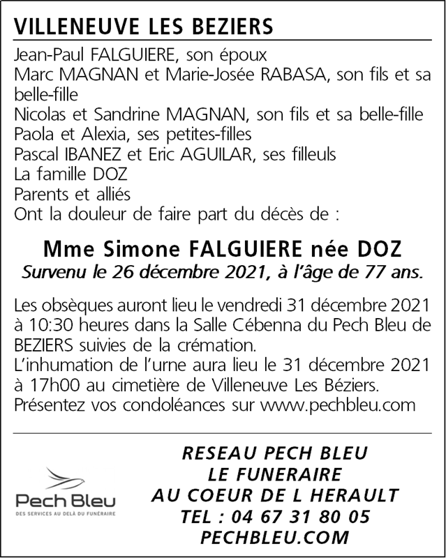 Décédée à Béziers (34500, France) le dimanche 26 décembre 2021 à l'âge de 77 ans