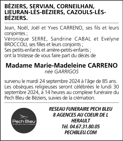Décédée à Béziers (34500, France) le mardi 24 septembre 2024 à l'âge de 85 ans