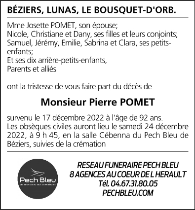 Décédé à Béziers (34500, France) le samedi 17 décembre 2022 à l'âge de 92 ans