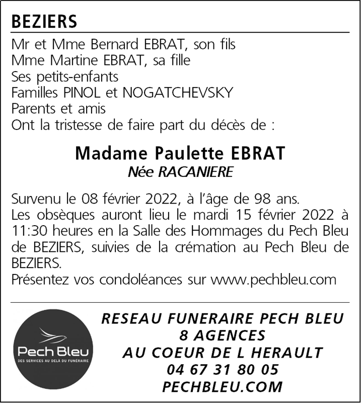 Décédée à Béziers (34500, France) le mardi 8 février 2022 à l'âge de 98 ans
