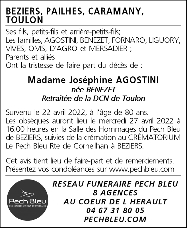 Décédée à Béziers (34500, France) le vendredi 22 avril 2022 à l'âge de 80 ans