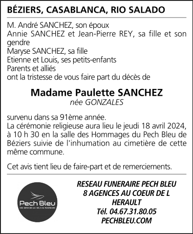 Décédée à Béziers (34500, France) le samedi 13 avril 2024 à l'âge de 90 ans