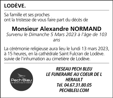 Décédé à Lodève (34700, France) le dimanche 5 mars 2023 à l'âge de 103 ans