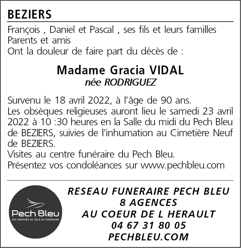 Décédée à Béziers (34500, France) le lundi 18 avril 2022 à l'âge de 90 ans