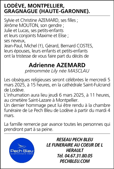 Décédée à Lodève (34700, France) le samedi 1 mars 2025 à l'âge de 93 ans