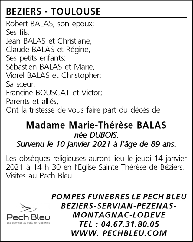 Décédée à Béziers (34500, France) le dimanche 10 janvier 2021 à l'âge de 89 ans