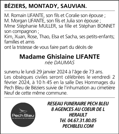 Décédée à Béziers (34500, France) le lundi 29 janvier 2024 à l'âge de 73 ans