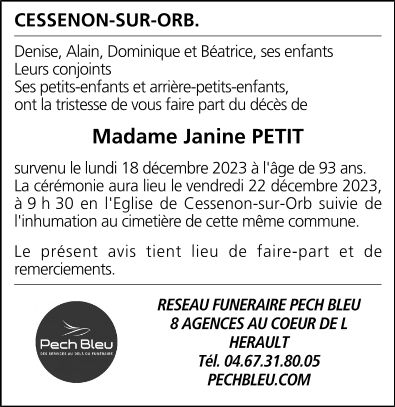 Décédée à Béziers (34500, France) le lundi 18 décembre 2023 à l'âge de 93 ans