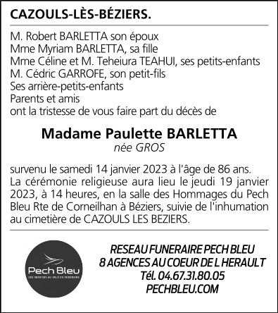 Décédée à Cazouls-lès-Béziers (34370, France) le samedi 14 janvier 2023 à l'âge de 86 ans